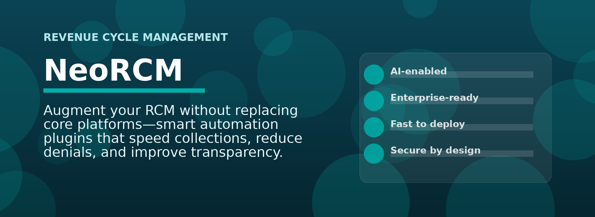 NeoRCM augments your existing RCM stack with intelligent automation across key revenue cycle stages. It continuously validates data, automates claim workflows, tracks claim status, and accelerates reconciliation—ensuring faster, more accurate reimbursements with full auditability.